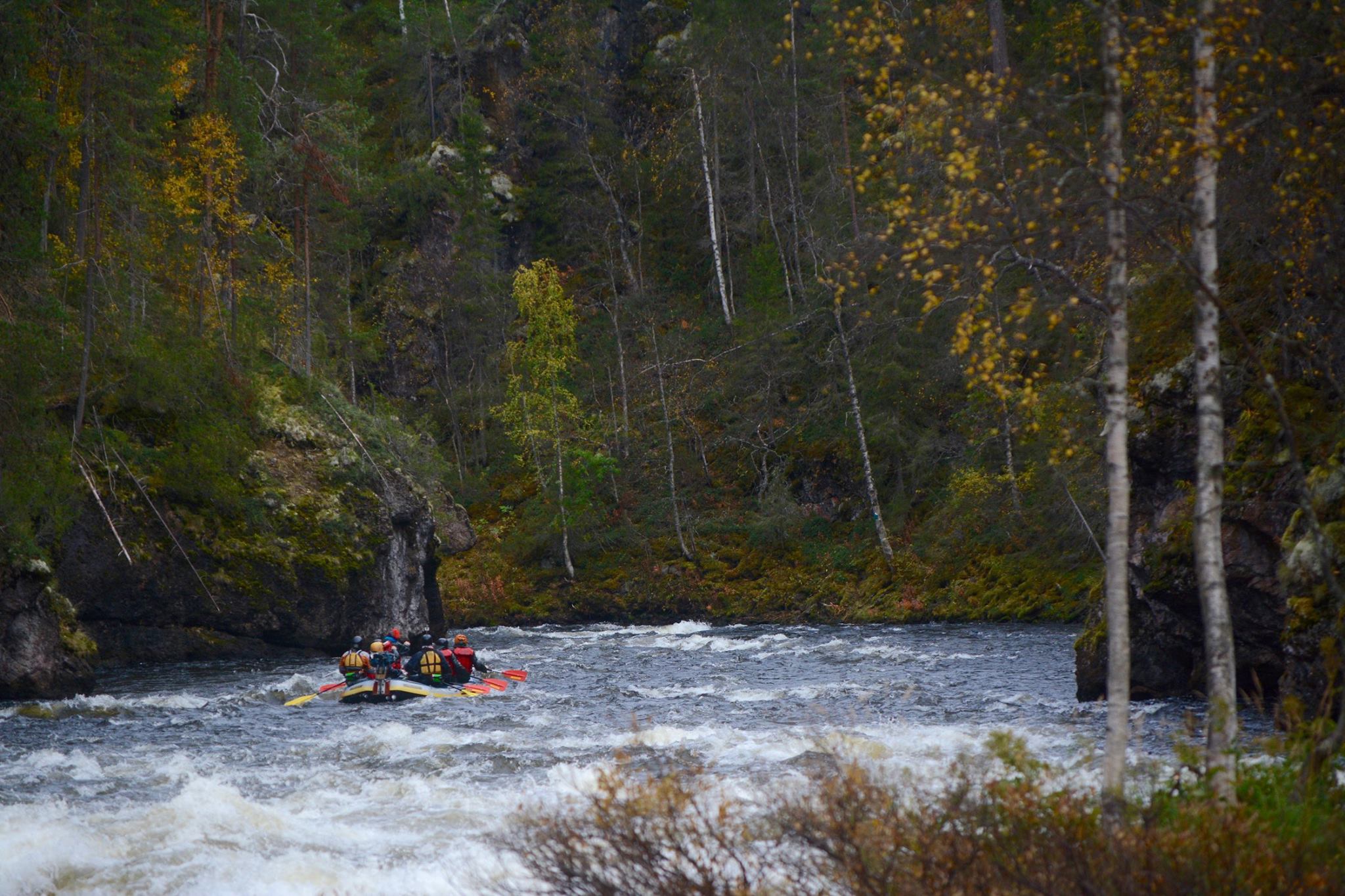 Ei muuta kuin koskea päin. Opin muun muassa, että koskessa pitää porukan aktiivisesti meloa, silloin kumivene pysyy oikealla reitillä. Vaikka välillä näyttikin, että menisimme päin kalliota, mutta niin vain vene keikkui läpi kuohujen.